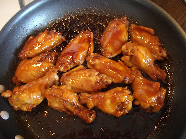 Place wings in the skillet, and pour the sauce evenly over the chicken.