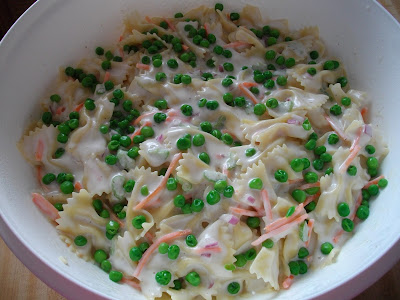 Repeat mixing the pasta, carrots, onion and celery together, (in small amounts) in the medium sized bowl along with the dressing, then place ontop of the salad in the "very" large size bowl, along with some of the peas.